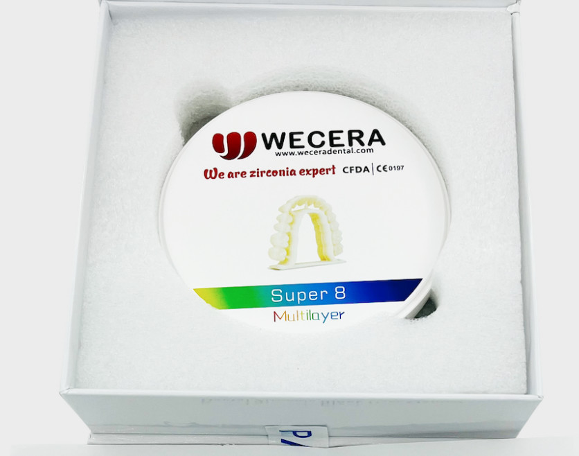 Wecera offers customized product services for the Super 8 multilayer zirconia block, designed to meet the highest standards in zirconia dental ceramics. Manufactured in China, this dental zirconia block is certified by CE, FDA, and ISO13485, ensuring top-quality and safety for dental applications.
